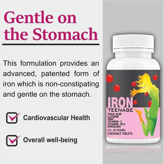 Iron Tablets with Folic Acid, Vitamin C, B12, lysine, Spirulina & Zinc Chewables for Women & Teenagers - 60 Count