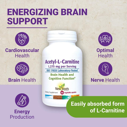 New Roots Acetyl L-Carnitine Supplement 1275mg - Premium ALCAR for Brain Support, Memory, Cardiovascular Health - 90 Veg Capsules - Non-GMO