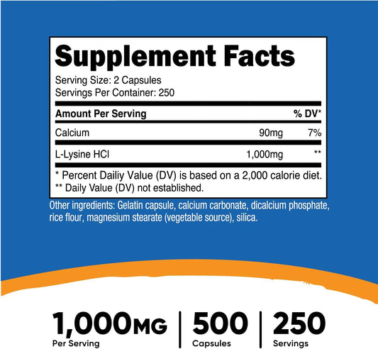 Nutricost L-Lysine 1000mg - 500 Capsules (250 Servings), Gluten Free, Non-GMO - 500mg Per Capsule