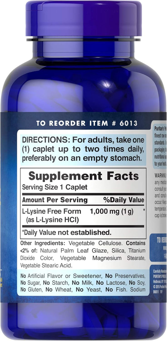 High Potency L-Lysine 1000mg Supplement - 250 Caplets by Puritan's Pride (6013)