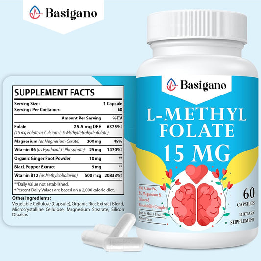 Basigano 15mg L Methylfolate (5-MTHF) Capsules with Vitamins B6 and B12 - 60 Vegetarian Capsules - Non-GMO, Gluten-Free Formula