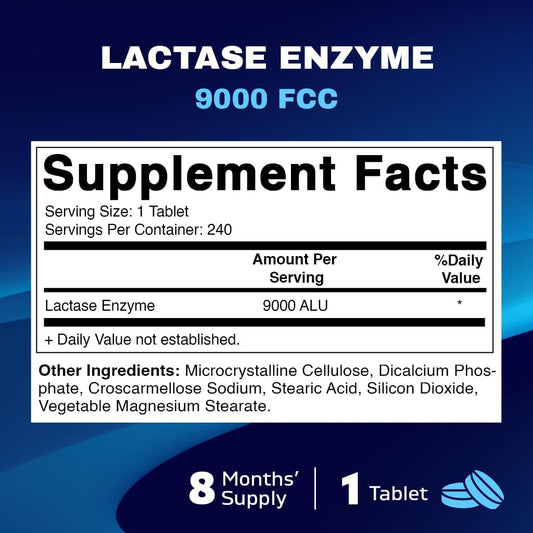 High Potency Lactase Enzyme Tablets for Lactose Intolerance Relief - 180 Count, 9000 FCC ALU, Fast Acting Formula - Natural Digestive Support