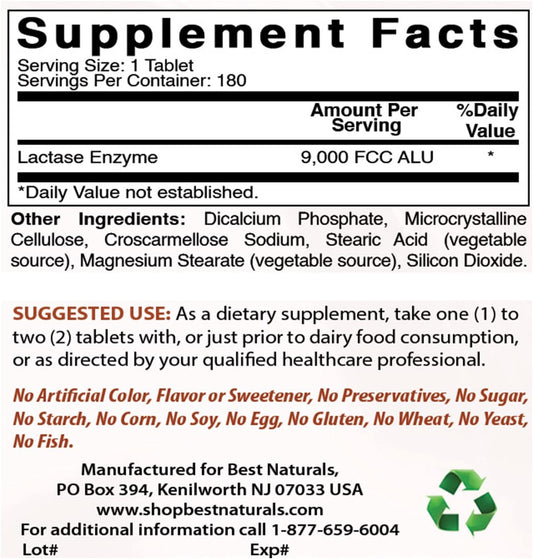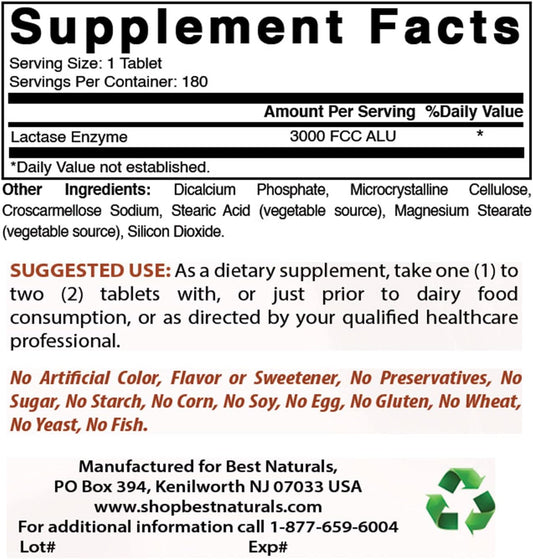 Fast Acting Lactase Enzyme Tablets - 180 Count (3000 FCC ALU) - Best Naturals