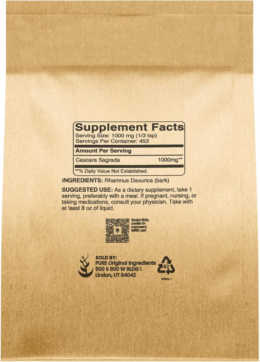 Natural Cascara Sagrada Bark Powder (1lb) - Pure, Non-GMO, Gluten-Free, High in Glycosides - Digestive Health Supplement
