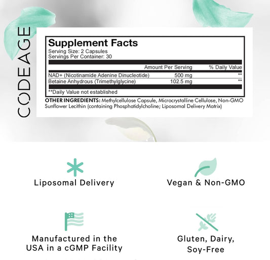 Codeage Liposomal NAD+ Supplement with Betaine Anhydrous - 500mg NAD+ Per Serving - Vegan, Non-GMO - 60 Capsules