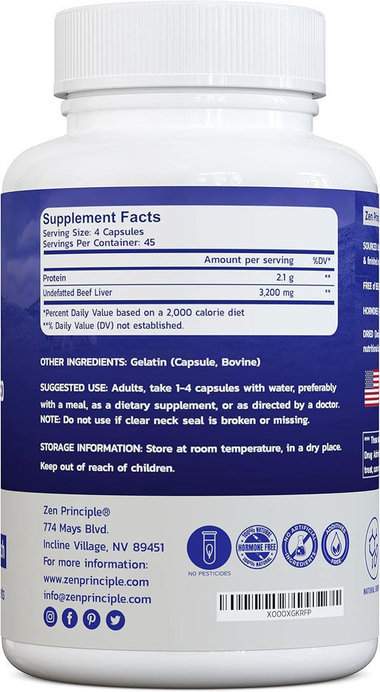 Grass-Fed Beef Liver Supplement, 360 Capsules. Desiccated Liver, No Hormones or GMO. Natural Energy from Iron, Protein, Vitamins. Zen Principle, Pasture-Raised Cows.