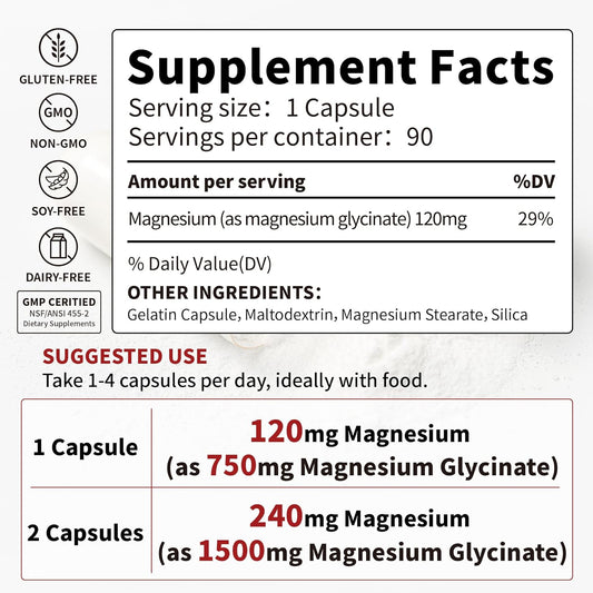 High Absorption 750mg Magnesium Glycinate Supplement with 120mg Magnesium - Support Heart, Nerves, Muscles & Bone Health - Relieve Stress, Improve Sleep - 120 Capsules