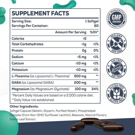 High Potency Liposomal L-Theanine with GABA & Magnesium for Stress Relief - 60 Capsules, Non-GMO & Gluten Free