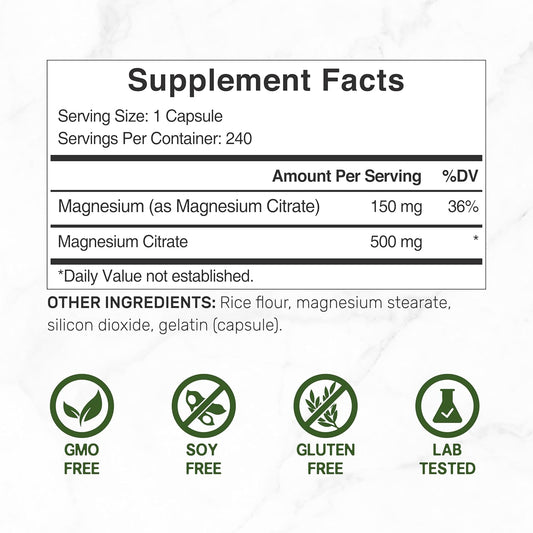 Highly Absorbable Magnesium Citrate 500mg Capsules - 240 Count - Supports Muscle, Heart, & Digestive Health - Non-GMO, Easy-to-Take Daily Supplement