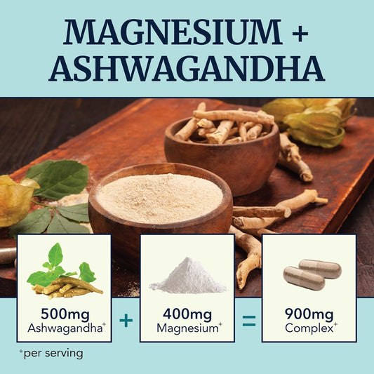 Magnesium Ashwagandha Supplement for Relaxation & Sleep Support - 400mg Mag Citrate & Oxide + 500mg Ashwagandha - Muscle Health & Stress Relief - 120 Ct Bottle