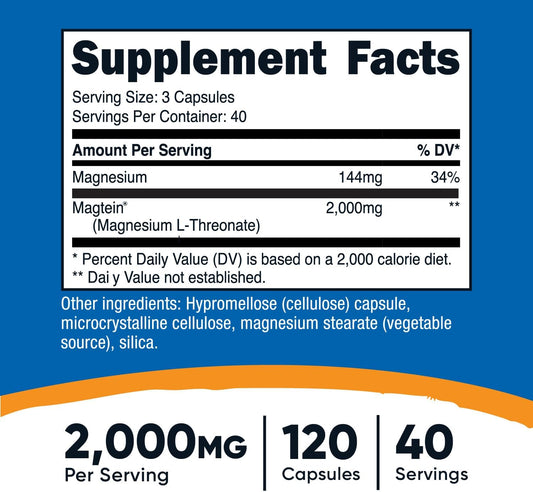 Nutricost Magtein Magnesium L-Threonate Capsules 2000mg - 120 Count, Non-GMO, Gluten Free, Vegetarian Friendly