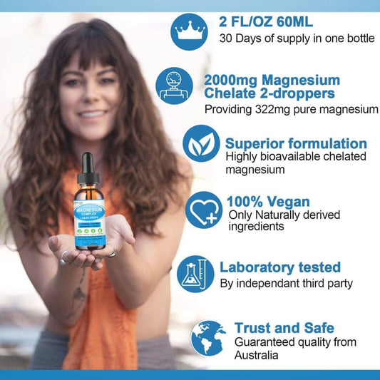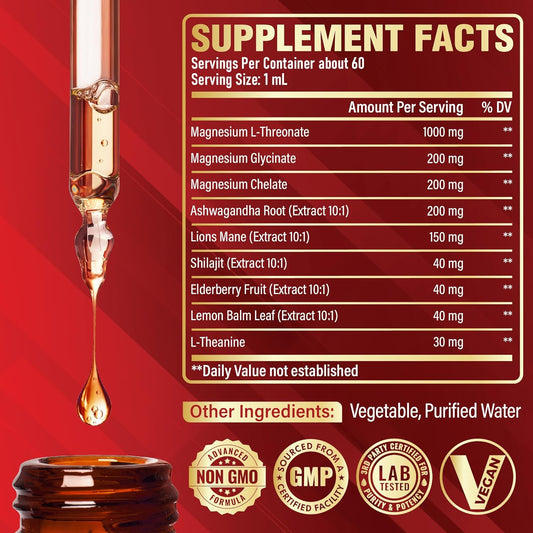 AMENQ HEALTH Magnesium Complex Liquid with L-Theanine, Ashwagandha, Lemon Balm, D3, B6 - Supports Cortisol, Memory, Brain Health, Calmness, and Sleep - 2 Fl Oz