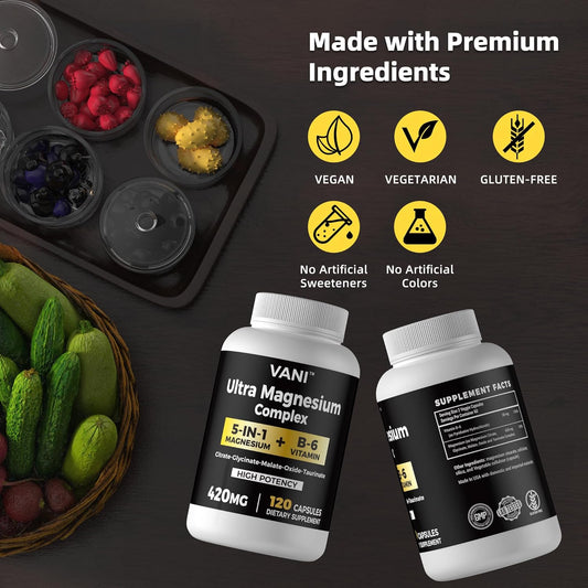 VANI Magnesium Glycinate Complex with B6 for Nerve, Heart, Muscle Health - 420mg, 120 Vegan Capsules, Gluten Free