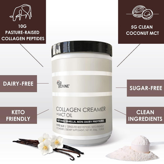 Vanilla Collagen Creamer with MCT Oil for Coffee - Grass Fed Protein Peptides - Keto & Paleo Friendly - Supports Skin, Joints, Hair, Nails - No Sugar - Elavonne