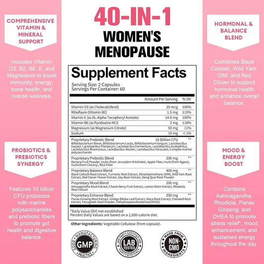 40-in-1 Menopause Supplements for Women, w/Probiotics, DIM, Vitex, Dong Quai, Red Clover and More, Easy to Swallow, Gluten Free
