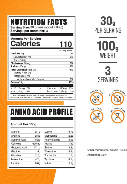 BulkSupplements Casein Protein Powder - Micellar Casein, Gluten & Soy Free - 30g per Serving - 100g (3.5 oz) - 1 Pack