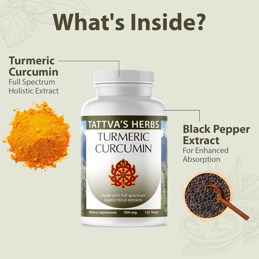 500mg Turmeric Curcumin Antioxidant Supplement with Black Pepper, 75% Curcuminoids - 120 Veg Capsules by Tattva's Herbs