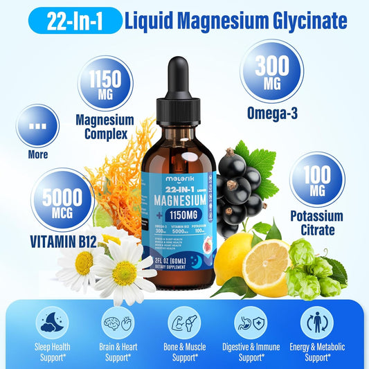 1150mg Magnesium Glycinate Liquid with Citrate, Taurate - Triple Magnesium Complex Drops with Omega3, B12, B6, C, D, Zinc, Potassium for Night, Digestive Support - Strawberry Flavor