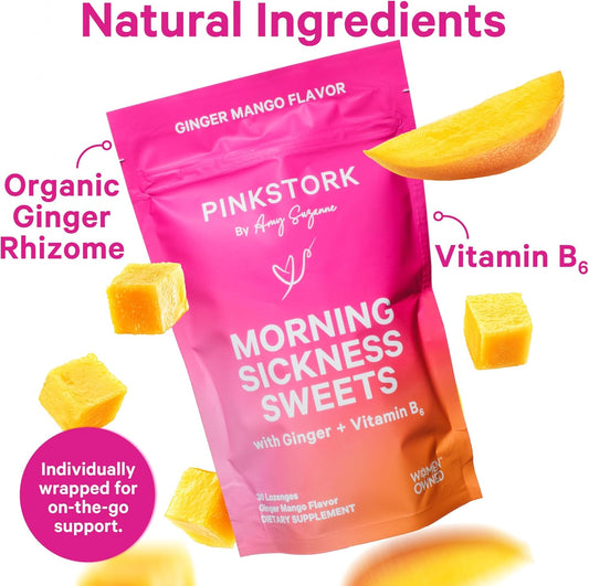 Organic Mango Ginger Morning Sickness Sweets with Vitamin B6 - Prenatal Relief for Morning Sickness, Motion Sickness, and Heartburn - 30 Wrapped Drops