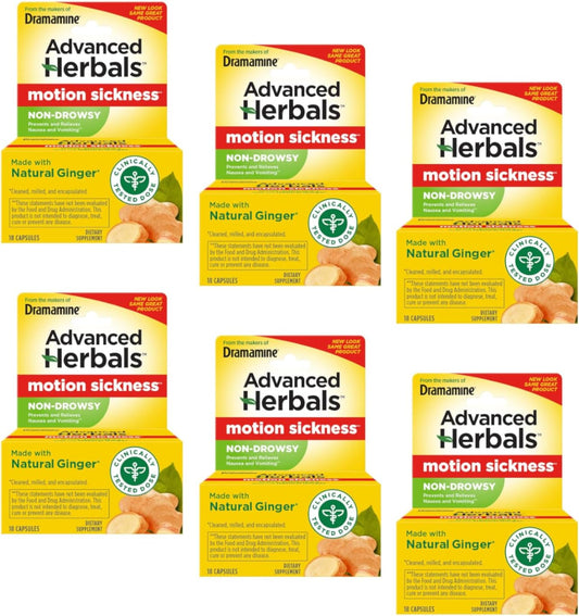 Motion Sickness Relief Caplets, Non-Drowsy Herbal Formula, 18 Count x 6 Packs - Dramamine Advanced Herbals
