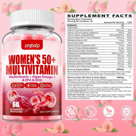 Sugar-Free Womens Multivitamin 50 Plus Gummies with Calcium, Magnesium, Zinc, Vitamin A, C, D3, E, K2, B Complex, Folate, Biotin - Multi Vitamins & Minerals for Skin, Energy, Immune Support