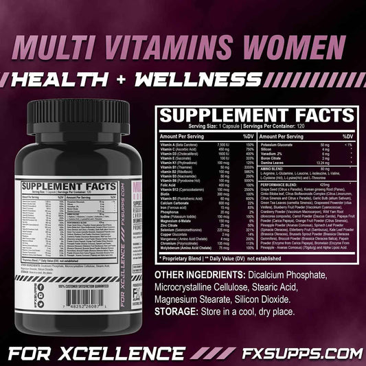 FXSUPPS Multivitamin for Women with Vitamin C, Vitamin D, Vitamin E, Zinc for Immune Support - Vegan Women's Multivitamin with Biotin, Iron, Antioxidants + Amino Acids (120 Count)