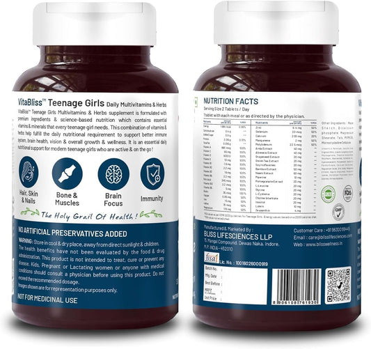 Teenage Girl Multivitamin with Calcium, Magnesium, Zinc, Aloe Vera, Bamboo, Grapeseed Extract - 60 Tablets for Immunity and Health