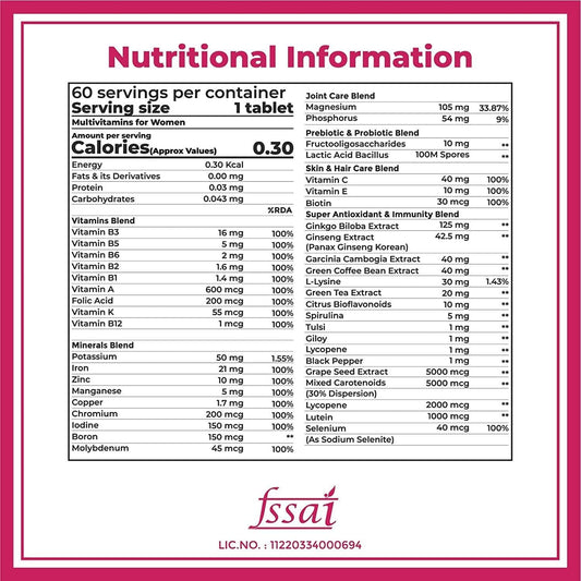 Zeeke Boldfit Women's Multivitamin Supplement with Probiotics - 42 Vital Ingredients for Immunity, Hair, Skin & Bone Support - 60 Tablets