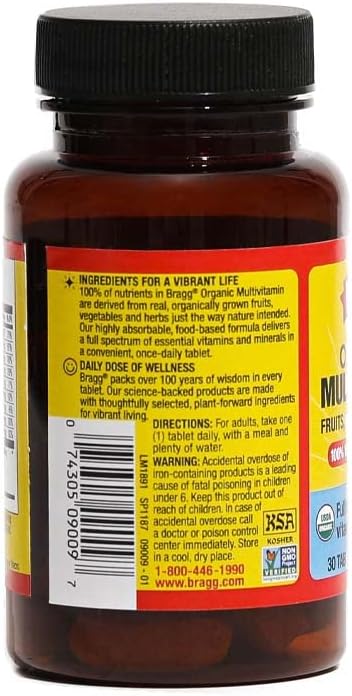 Organic Multivitamin for Women and Men - 30 Tablets - Daily Whole Food Supplement with Vitamin A, C, D3, and More by Bragg