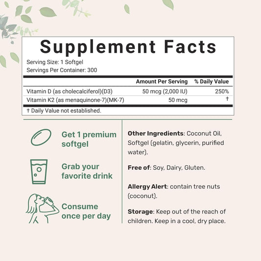 Vitamin D3 2,000 IU with K2 (MK-7) 50mcg & Coconut Oil Softgels - 300ct | Supports Bone, Heart, & Immune Health | Calcium Absorption | Easy-to-Swallow Supplement