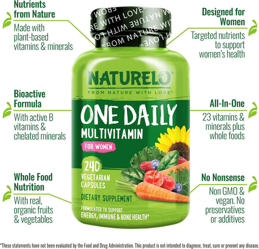 NATURELO Women's Daily Multivitamin - Energy Support, Hair Skin Nails - Whole Food Supplement, Non-GMO, No Soy, Gluten Free - 240 Capsules, 8 Month Supply