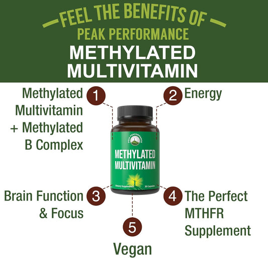 Methylated Multivitamin with TMG, L Methylfolate, Methyl B12 + B Complex. Vegan Capsules for Peak Performance. MTHFR Supplement for Men & Women.