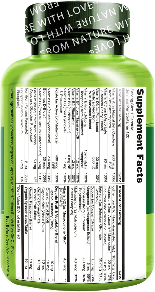 Women's Whole Food Multivitamin with Vitamins, Minerals, Organic Extracts - Energy & Heart Health - Vegan, Non GMO - 120 Capsules