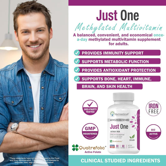 NatureGenX Methylated Multivitamin - 60 Caps - Pure Methyl B12 & Methylfolate - Iron Free - Men & Women - Gluten Free - 2 Months Supply