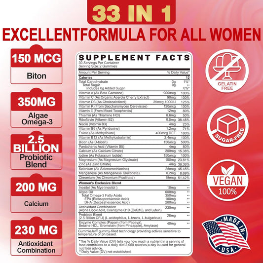 Sugar-Free Womens Multivitamin Gummies with Omega-3, Enzymes, Probiotic, Calcium, Vitamin C, D3, Folate, Biotin, Inositol for Skin, Hair Growth, Overall Health - NEVISS