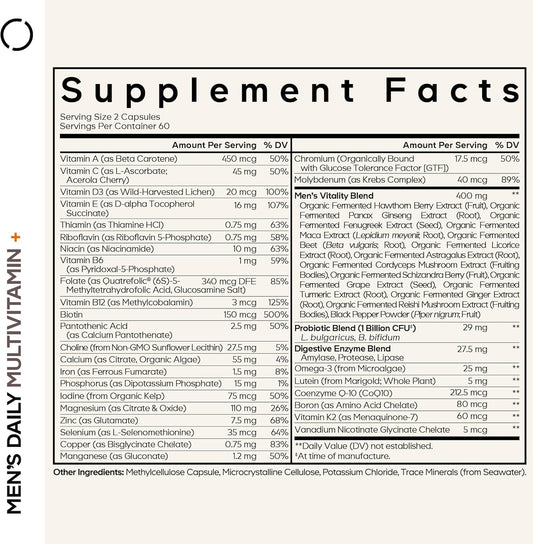 Organic Whole Foods Men's Daily Multivitamin with 25+ Vitamins & Minerals, Probiotic, Omega-3, and Zinc - 120 Capsules
