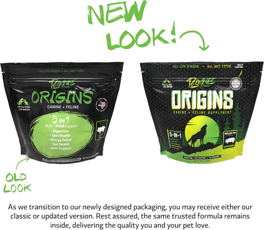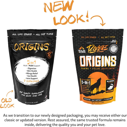 Rogue Pet Science Origins Dog Supplement - 5-in-1 Powdered Topper with Omega 3 Fish Oil - Promotes Healthy Skin, Coat, & Digestion - Reduces Itching & Joint Inflammation - 2 lbs