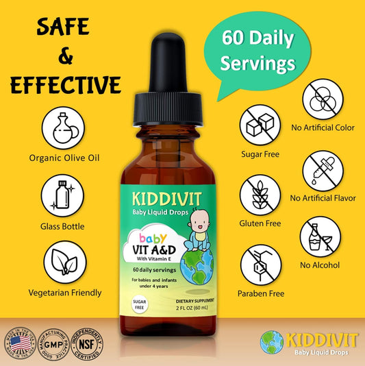 Kiddivit Baby Vitamin A&D Liquid Drops with Vitamin E - 60 Daily Servings - 2 Fl Oz Glass Bottle - Dropper Included, Sugar & Gluten Free