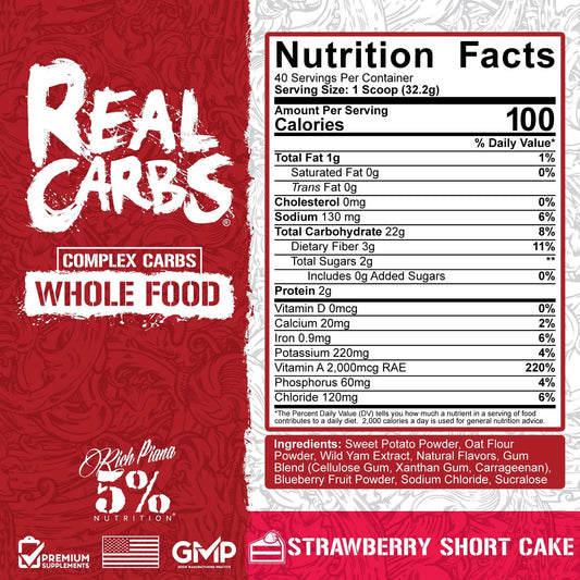 5% Nutrition Rich Piana Real Carbs: Complex Carbohydrates for Lasting Energy - Strawberry Shortcake Flavor - 2.84 lb, 40 Servings - Ideal for Pre-Workout/Post-Workout Recovery Meal