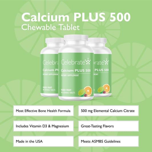 Bariatric Supplements: Celebrate Vitamins Calcium Plus - 500mg Calcium Citrate, 333 IU Vitamin D3 & 34mg Magnesium - Post Surgery Support - Berry Flavor, 270 Chewable Tablets