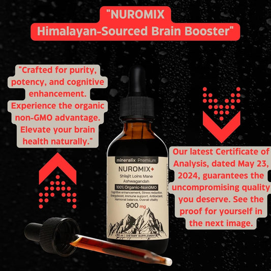 Organic Mineralix Premium Nuromix Shilajit Liquid Drops - 900mg with Lion's Mane & Ashwagandha - Non-GMO Energy & Immune Support Supplement