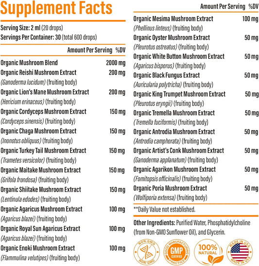 Organic Liposomal Mushroom Complex Drops - 2000 MG Liquid Formula with 20 Extracts - Immunity, Cognitive & Memory Support - Lions Mane, Reishi, Cordyceps, Chaga - 30 Servings