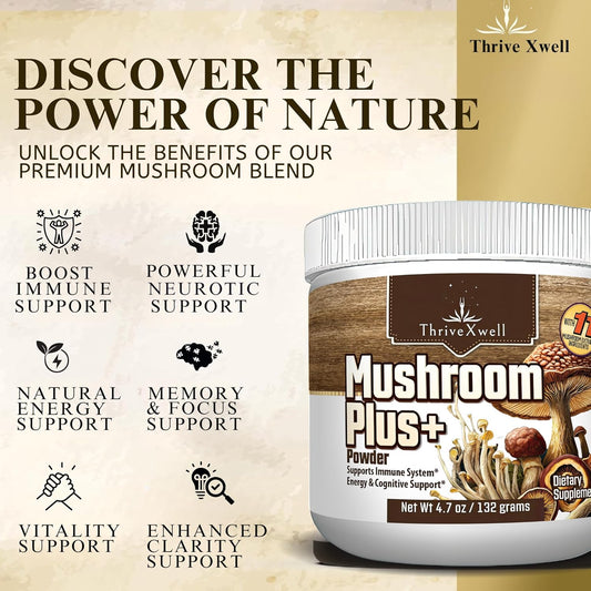 ThriveXwell Pure Mushroom Plus 11 in 1 Dietary Powder Supplement for Immune System & Energy - Chaga, Lions Mane, Reishi, Shiitake, Maitake - Filler Free, Gluten Free - 60 Servings