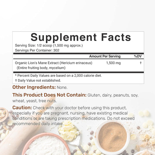Organic Lions Mane Mushroom Powder Supplement - 1lb, 1,500mg Per Serving - Brain Nootropic & Immune System Booster - Non-GMO - Active Fruiting Body & Mycelium Extract