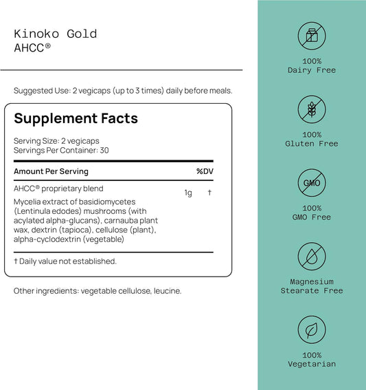 Premium Kinoko Gold AHCC Supplement - 500mg per Capsule - Supports Immune Health, Liver Function, Natural Killer Cells, & Cytokine Production - 60 Capsules