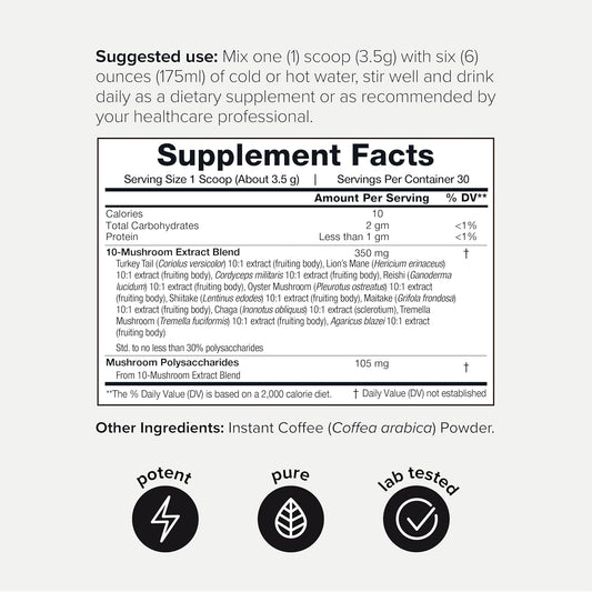 Toniiq Ultra Concentrated Mushroom Coffee 3,500mg 10:1 Extract - Colombian Sourced Beans with 10 Mushroom Blend including Lion's Mane and Cordyceps - Mushroom Powder Coffee Alternative Blend -TQ