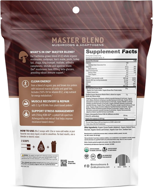 OM Mushroom Superfood Master Blend Plant-Based Protein Powder - Creamy Chocolate with 10 Mushroom Complex, Lions Mane, Adaptogens - 19.26 oz, 16 Servings - Optimal Health & Recovery
