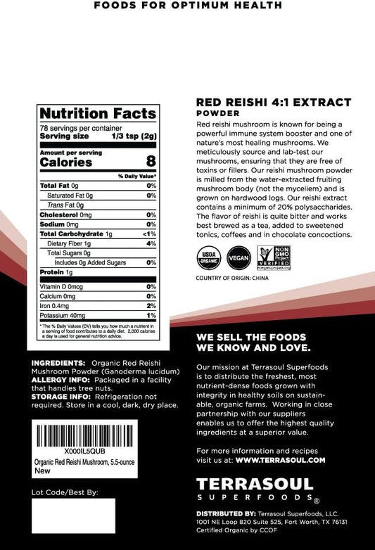 Terrasoul Superfoods Organic Reishi Mushroom Powder - 5.5 Oz (4:1 Extract) for Immune Support, Stress Relief, Better Sleep - Adaptogenic Mushrooms