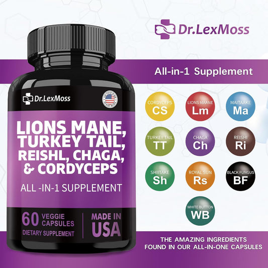 Organic Mushroom Supplement with Lions Mane, Turkey Tail, Reishi, Cordyceps, Chaga, Maitake, Meshima, Poria Cocos, Shiitake, Oyster, Porcini, Enoki - 60 Capsules - Dr. LexMoss