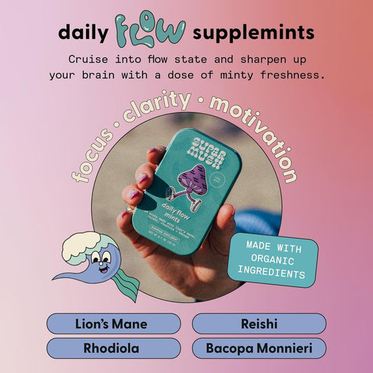 Organic SuperMush Daily Flow and Focus Supplement with Lions Mane, Reishi, Rhodiola & Bacopa Monnieri Extract - 20g Mint Flavor